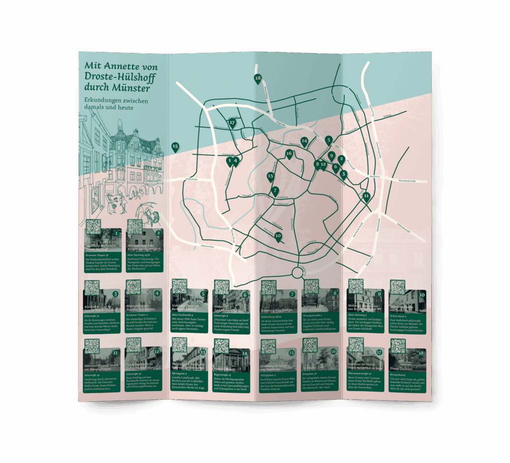 Dieser Rundgang erschließt in 18 Stationen die Lebenswelt der Dichterin, ihre Kontakte und Begegnungen und macht ihre Wege in und durch Münster begehbar. Auf deinem Spaziergang begleiten dich Drostes Briefe und Gedichte, die du selbst lesen oder dir vorlesen lassen kannst.