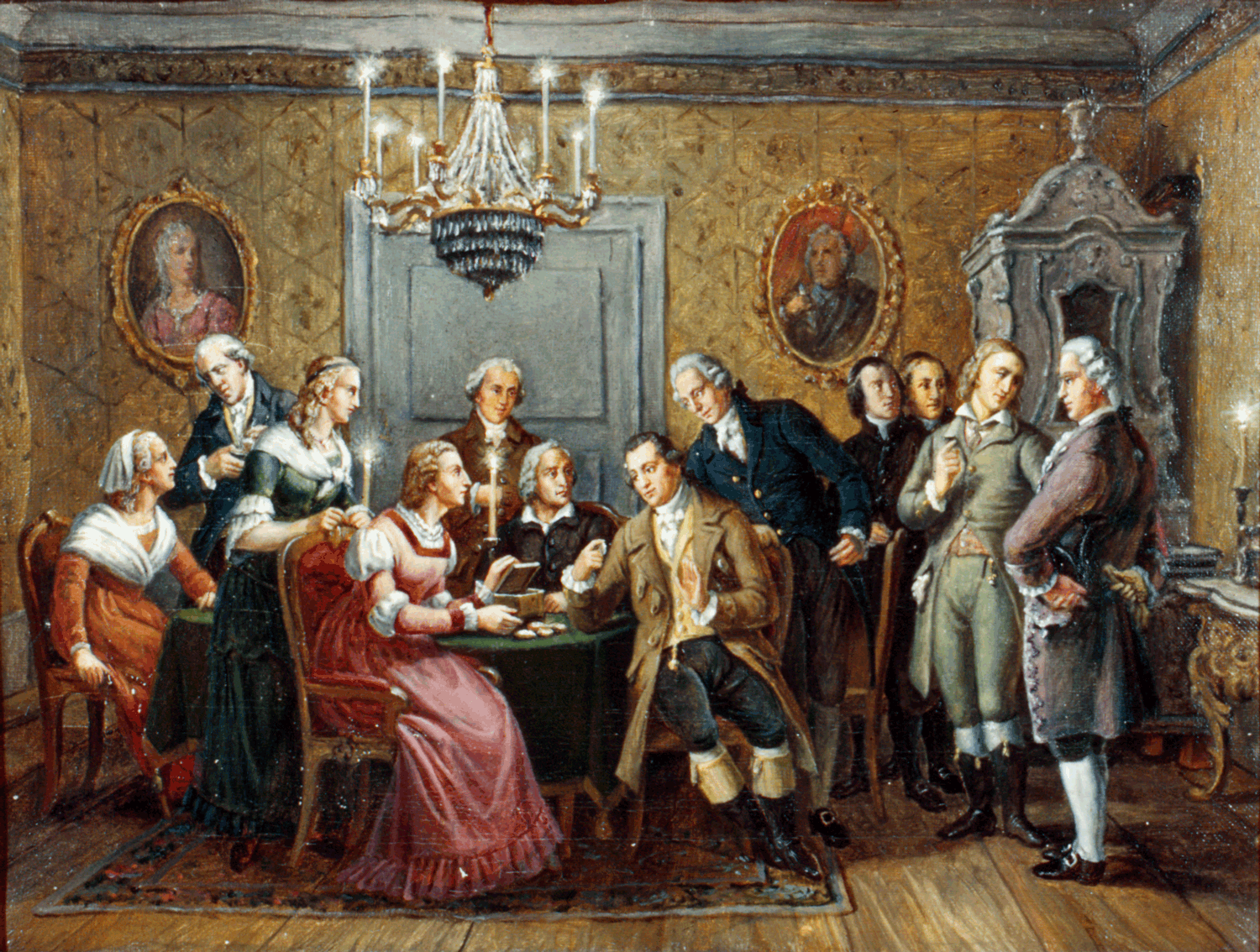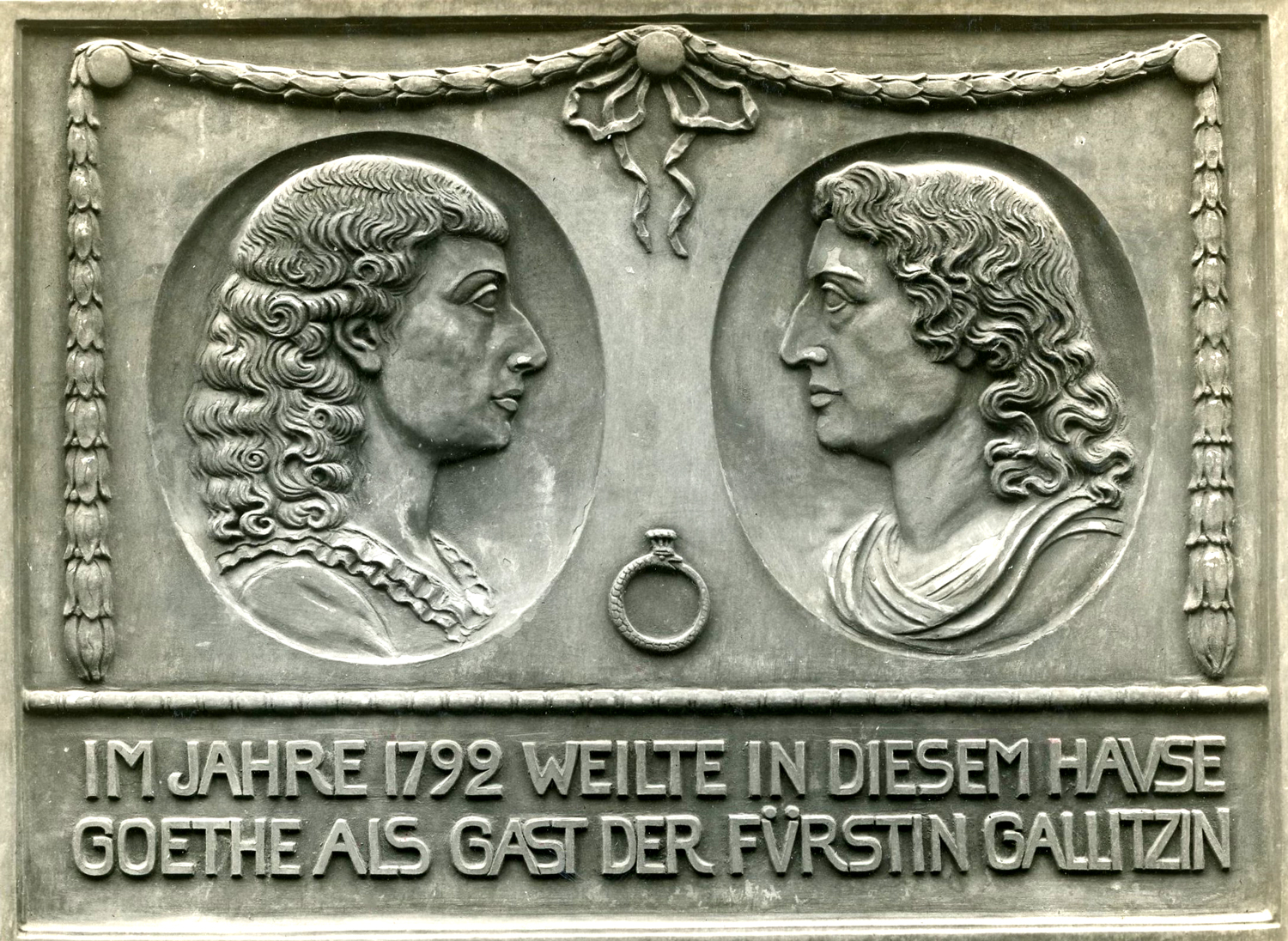 1785 reist Amalie von Gallitzin in Begleitung von Fürstenberg, Hemsterhuis und Sprickmann nach Weimar zu Goethe; wer im literarischen Feld etwas gelten will, muss das einfach tun. Anfang Dezember 1792 stattet Goethe der Fürstin einen mehrtätigen Gegenbesuch in der Grünen Gasse ab; man fühlt sich inspiriert voneinander, ohne dass eine wirkliche Freundschaft entsteht.