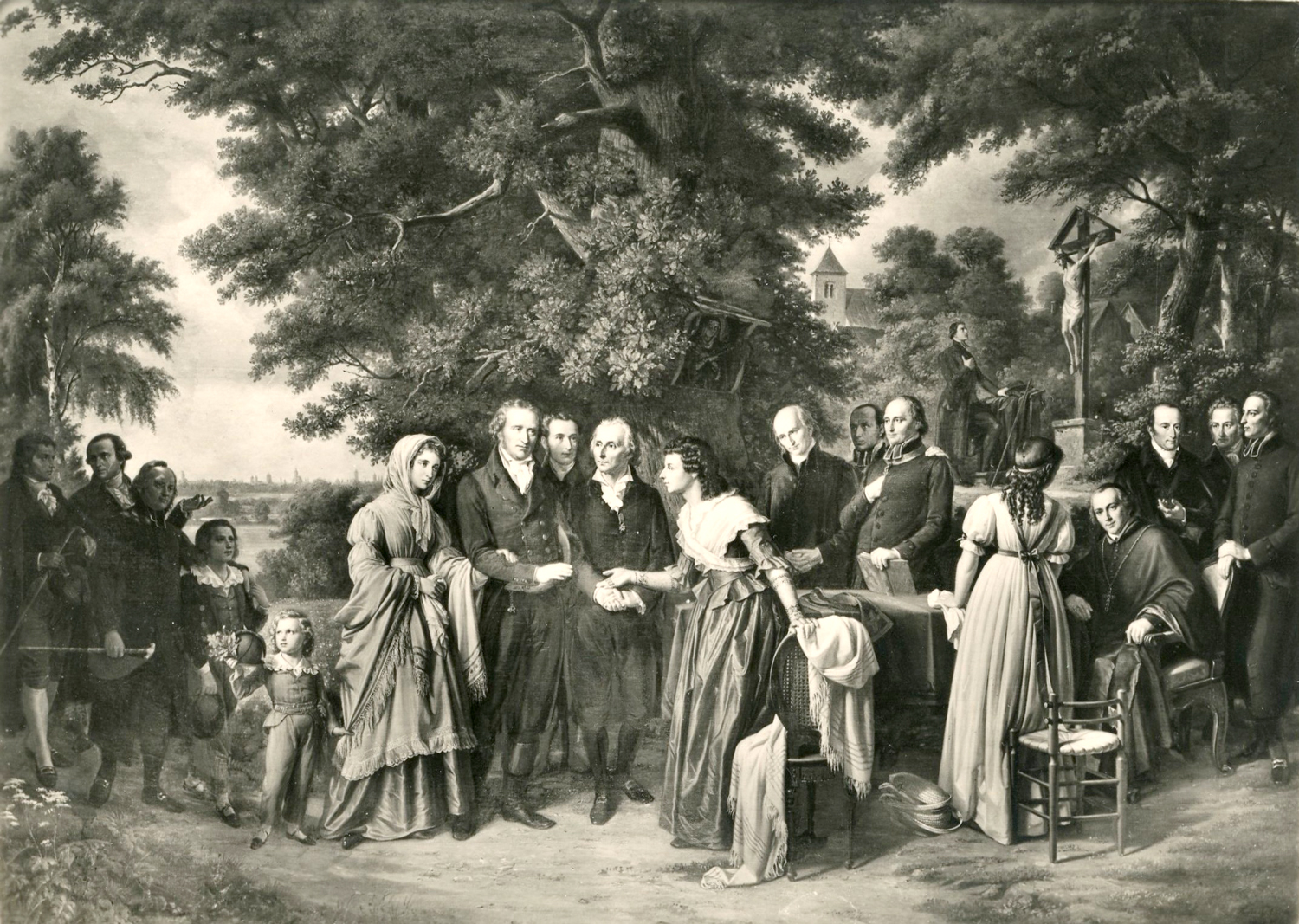 Gemälde „Die Fürstin Gallitzin im Kreis ihrer Freunde“ von Theobald von Oer aus dem Jahr 1864. Rechts neben dem kleinen Kind steht das zum Katholizismus konvertierte Ehepaar Stolberg, daneben Freiherr Adolph Droste-Vischering, der Domherr und Minister Franz von Fürstenberg sowie die Fürstin selbst. Ihre Tochter Marianne ist mit dem Rücken zum Betrachter dargestellt. Auch Anton Mathias Sprickmann (zweiter von rechts) gehörte zu diesem Kreis.