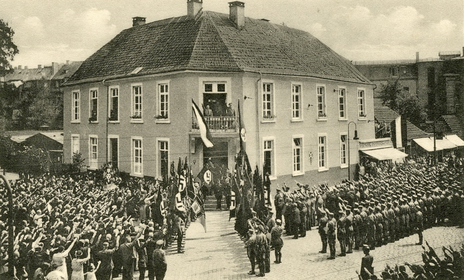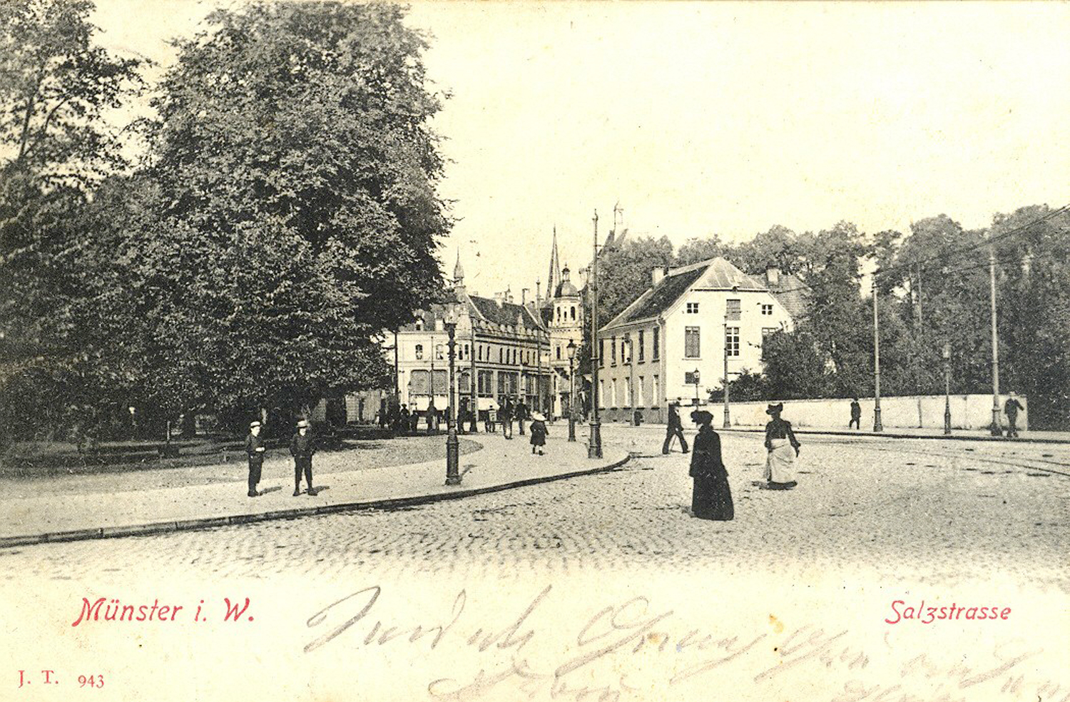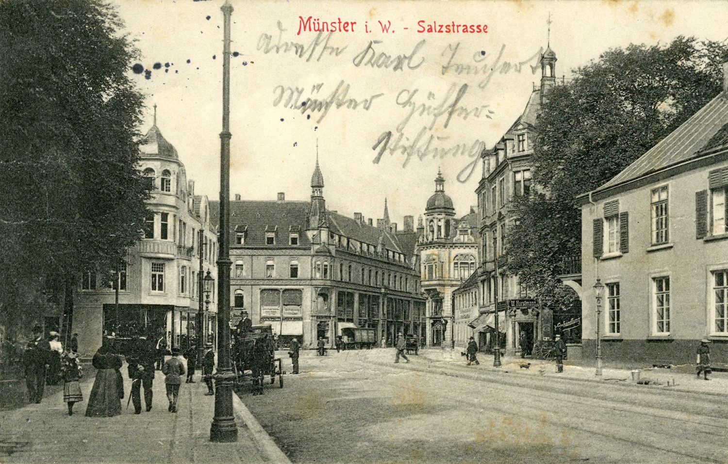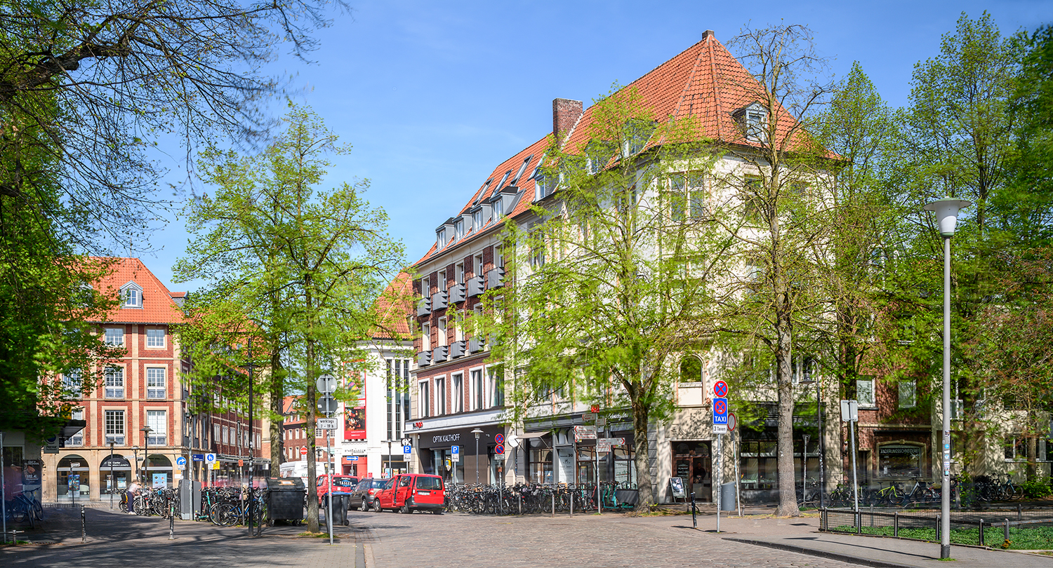 befindet sich heute der Servatiiplatz mit der Skulptur ‚münsters GESCHICHTE VON UNTEN‘. Die überlebensgroße Betonfigur zeigt den Münsteraner Aktivisten Paul Wulf (1921–1999) und ist ein im Rahmen der Skulptur-Projekte 2007 entstandenes Werk der Künstlerin Silke Wagner. Ihren Standort hat die Skulptur seit 2010 hier an der Promenade. Dass Wulf, der sich zeitlebens für die Aufarbeitung von NS-Verbrechen einsetzt, hier gewürdigt wird, hat auch einen geschichtlichen Bezug zum Ort. Während der NS-Zeit ist in dem Gebäude an dieser Stelle das ‚Amt für Kriegsopfer‘ der NSDAP untergebracht; es wird im Zweiten Weltkrieg vollständig zerstört.