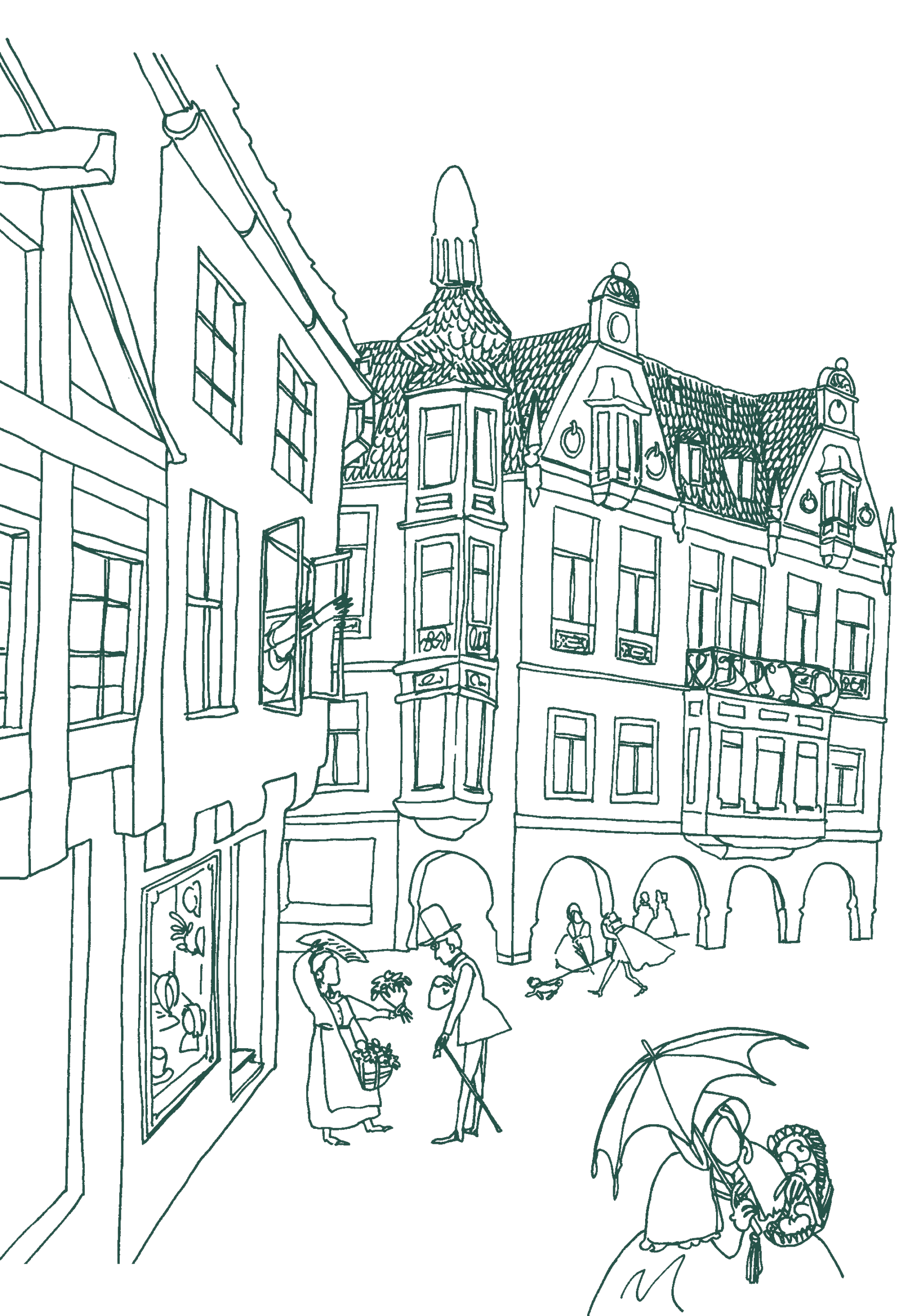 befindet sich heute ein Modehaus. Hier, wo die Salzstraße und der Prinzipalmarkt mit seinen charakteristischen Bogengängen aufeinandertreffen, wechseln über die Jahrhunderte hinweg häufig Mieter und Besitzer. Unterschiedliche hochwertige Waren aus Bereichen wie Genuss, Literatur und Textil werden in dem Gebäude in bester Lage angeboten. Zur Droste-Zeit sind es Wein und Seide, während gegen Ende des 19. Jahrhunderts die Paderborner Verlagsbuchhandlung Schöningh hier eine Niederlassung unterhält. Von Anfang des 20. Jahrhunderts bis in die 70er Jahre ist dann das bekannte ‚Kaufhaus zum Prinzipalmarkt‘ Bernhard Kluxen an dieser Stelle ansässig.